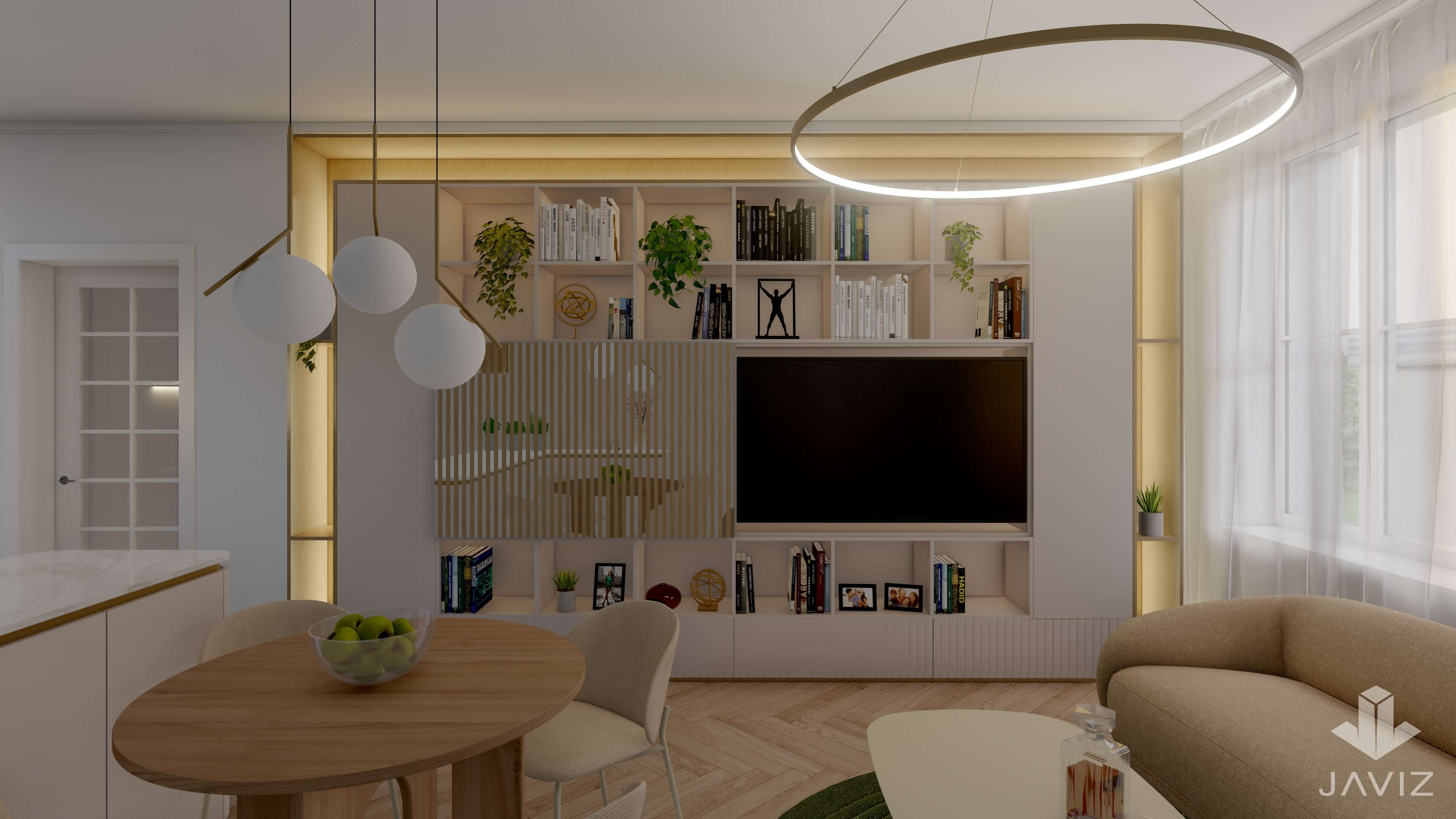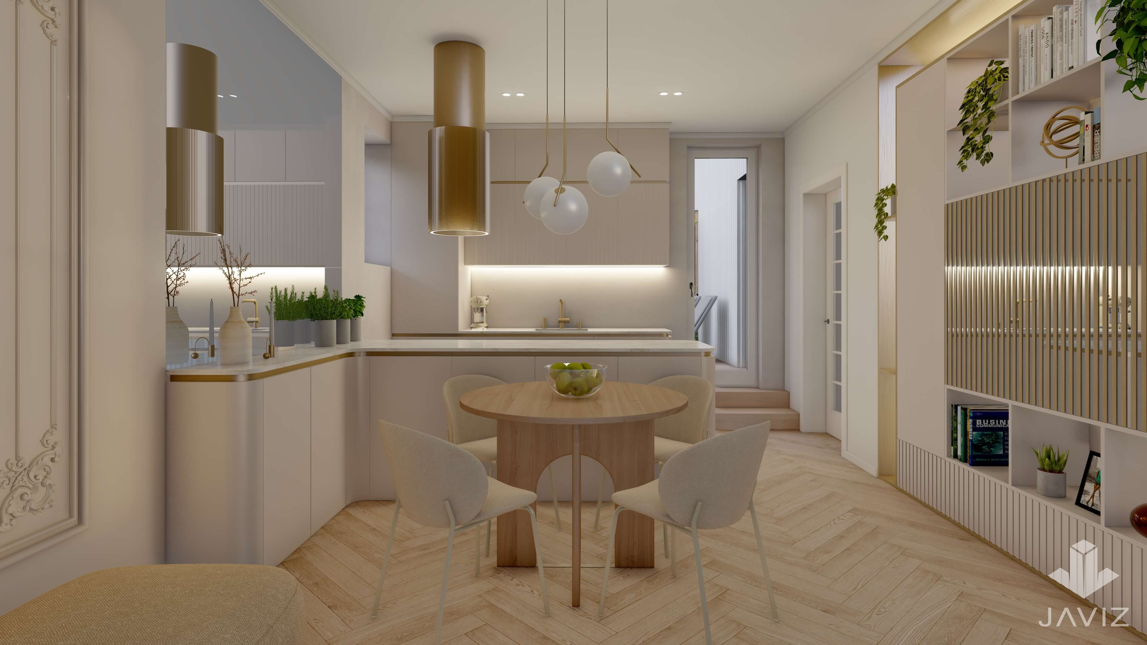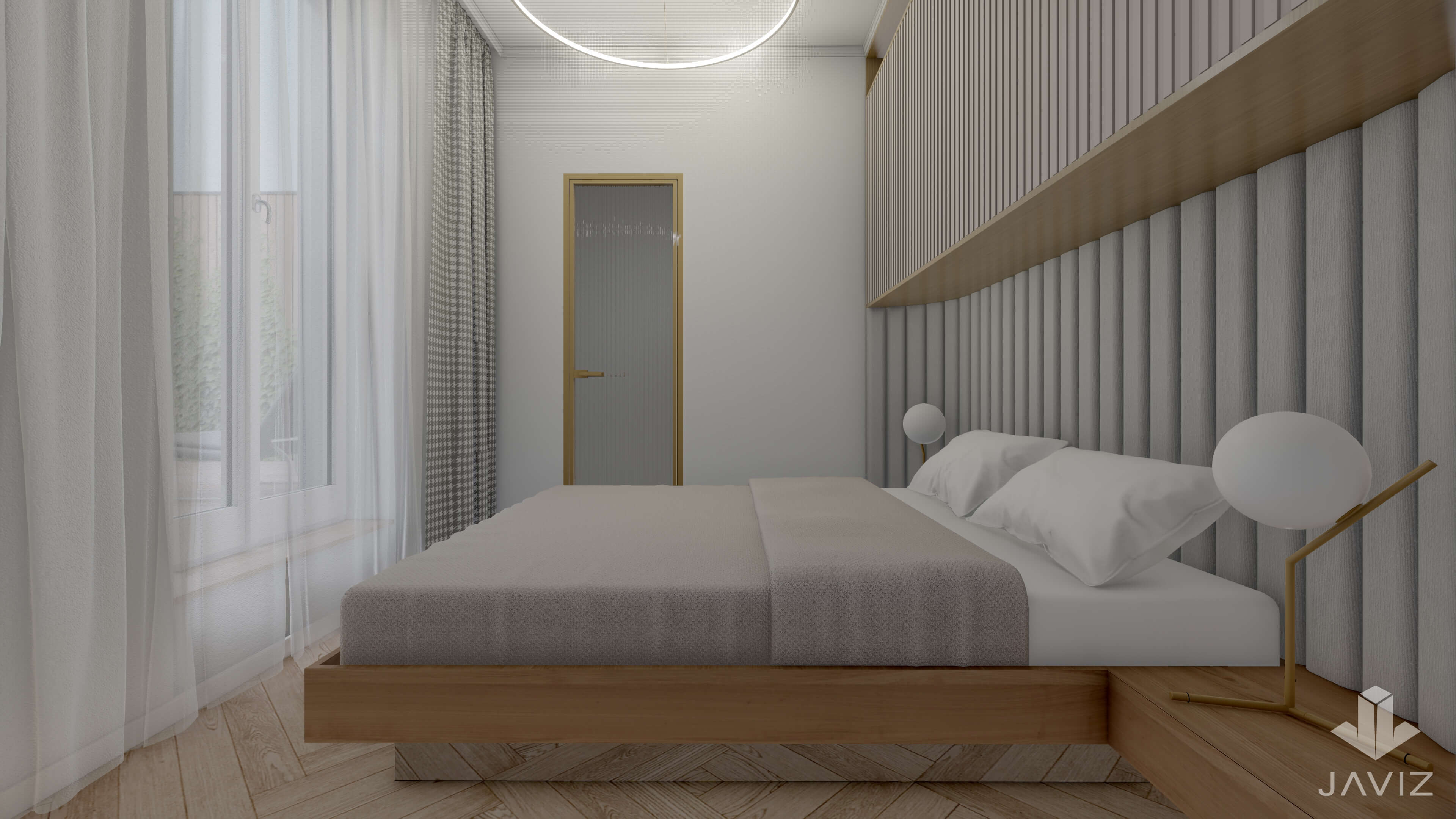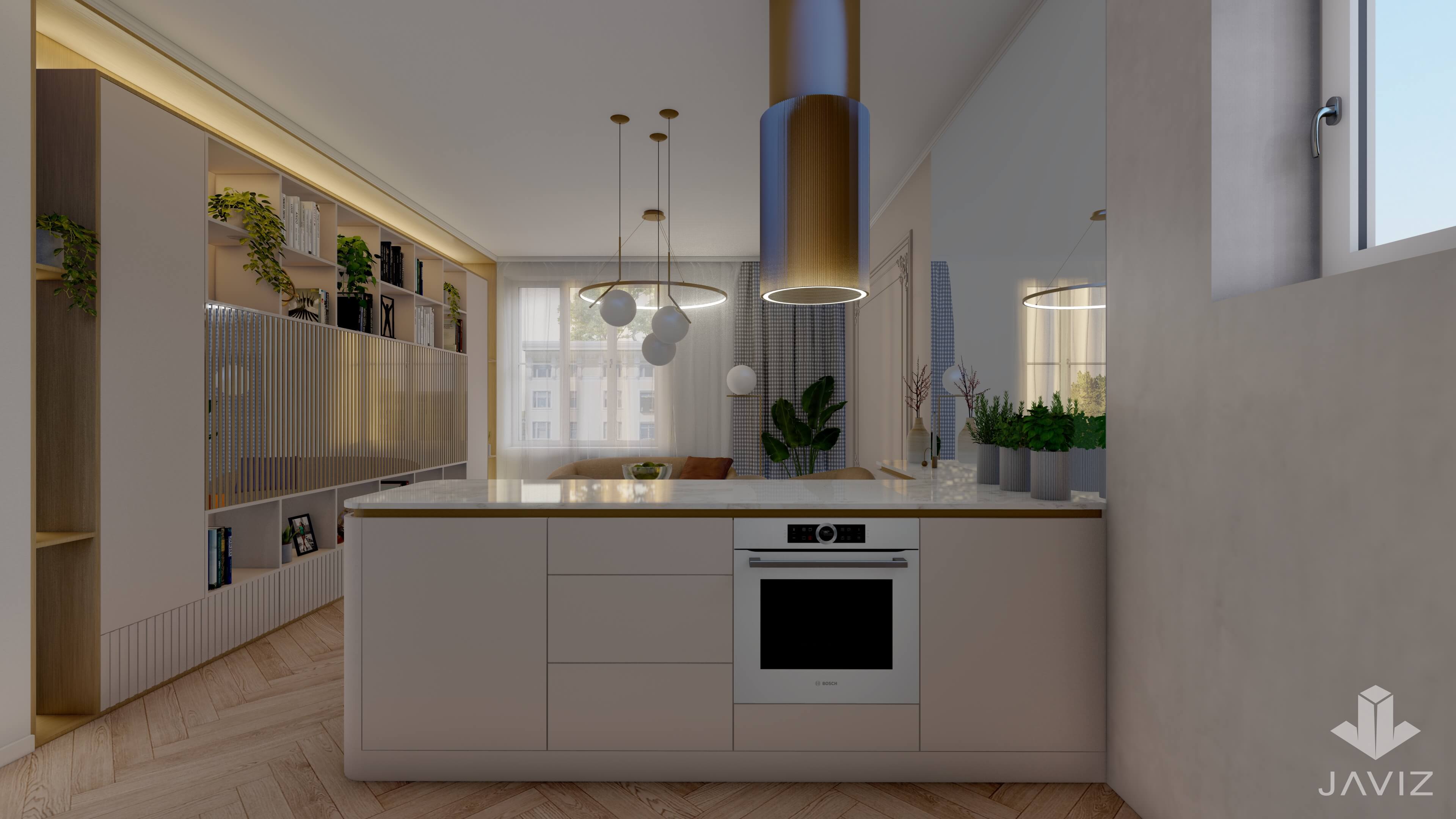 Návrh interiéru trojizbového bytu tvorí otvorená dispozícia obývačky s kuchyňou, spálňa, detská izba a chodba. Byt sa nachádza v citlivo obnovenom funkcionalistickom bytovom dome v blízkosti historickej vilovej štvrti pod Slavínom. Celý návrh v sebe nesie prvky minimalizmu s dôrazom na detail, symetriu a zladenie materiálov naprieč jednotlivými miestnosťami. V interiéri prevládajú zemité odtiene, poctivé prírodné materiály a zlaté akcenty. Organické sedenie v obývačke plynule prechádza k jedálenskému sedeniu, ktoré je obklopené tvarovo premysleným kuchynským ostrovom. Vstavaný nábytkový kubus v obývačke poskytuje okrem knižnice aj dostatok úložného priestoru. Požiadavku na diskrétne umiestnenie TV obrazovky sme vyriešili posuvnými zrkadlovými dvierkami, vďaka ktorým nepôsobí na stene nadmerne dominantným dojmom.