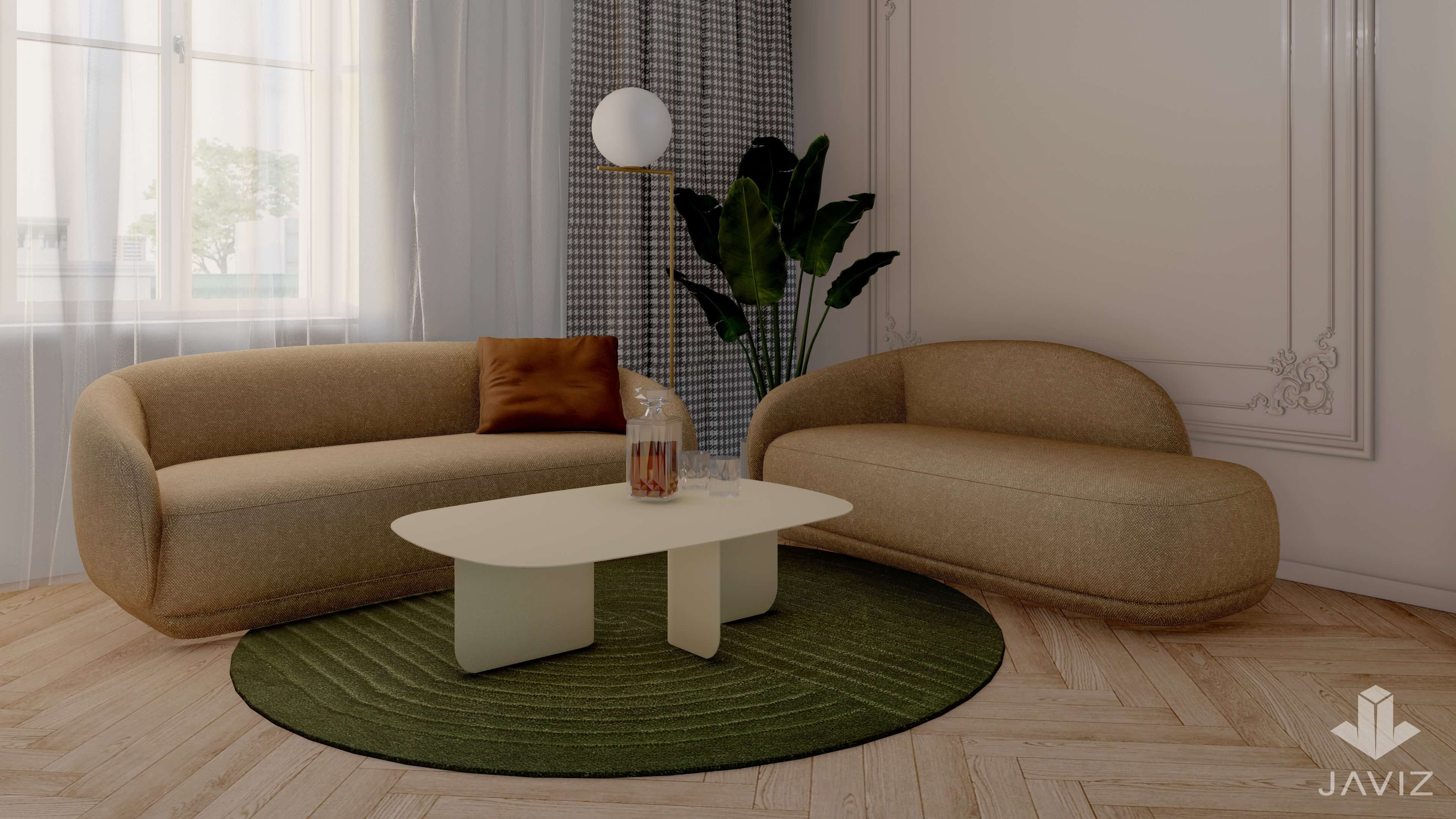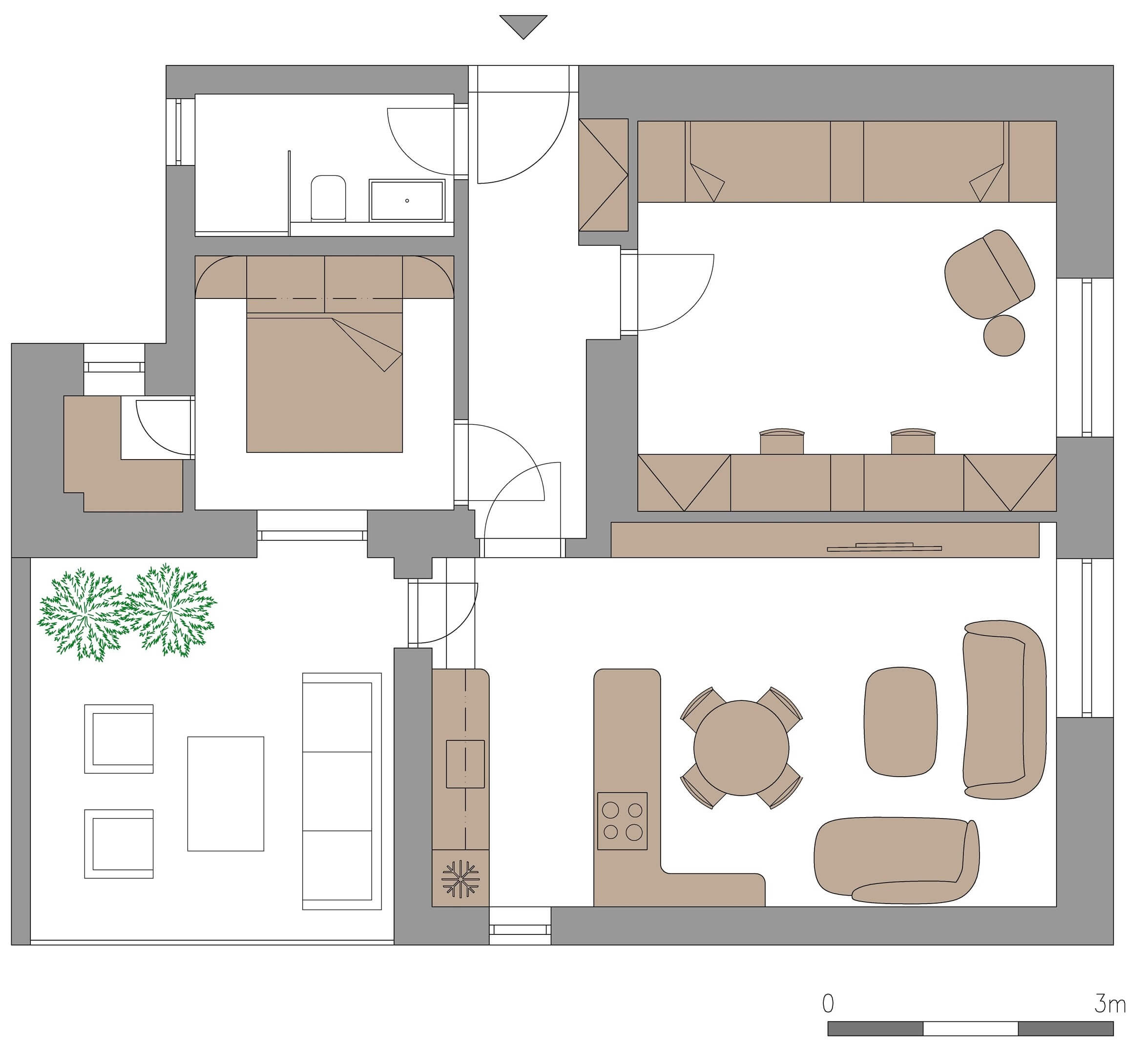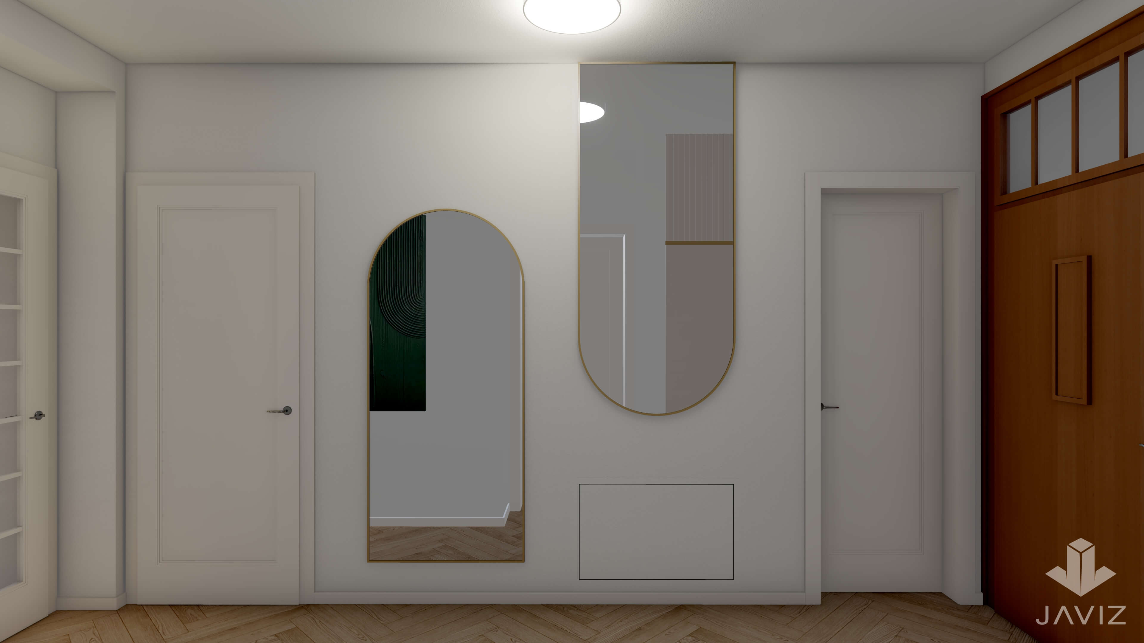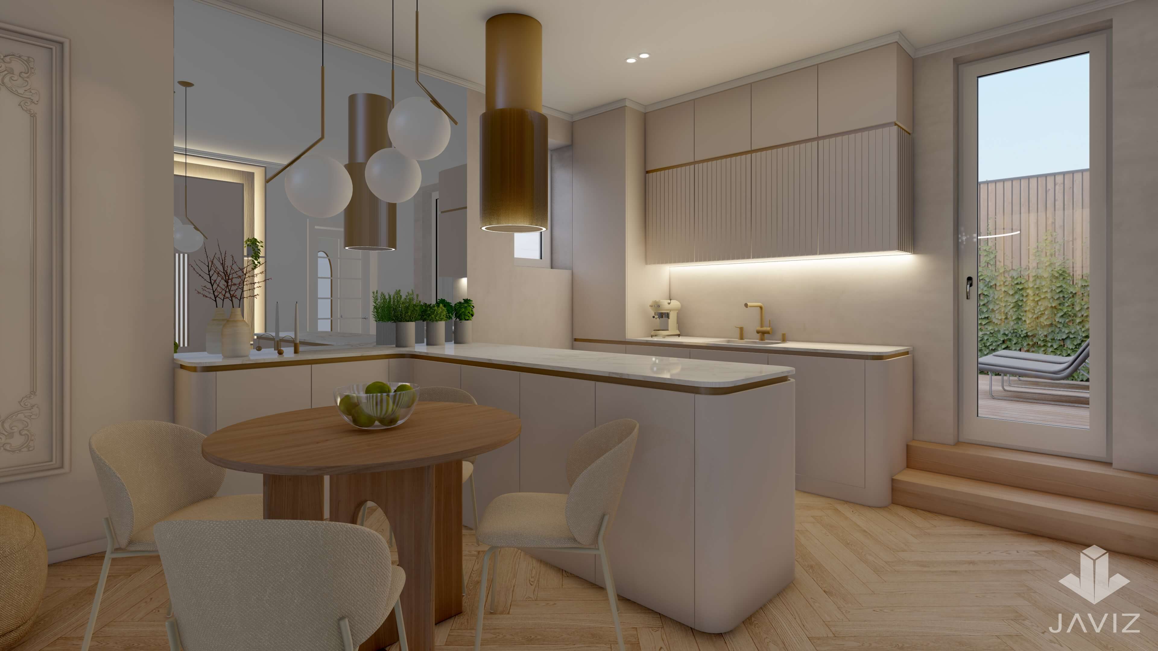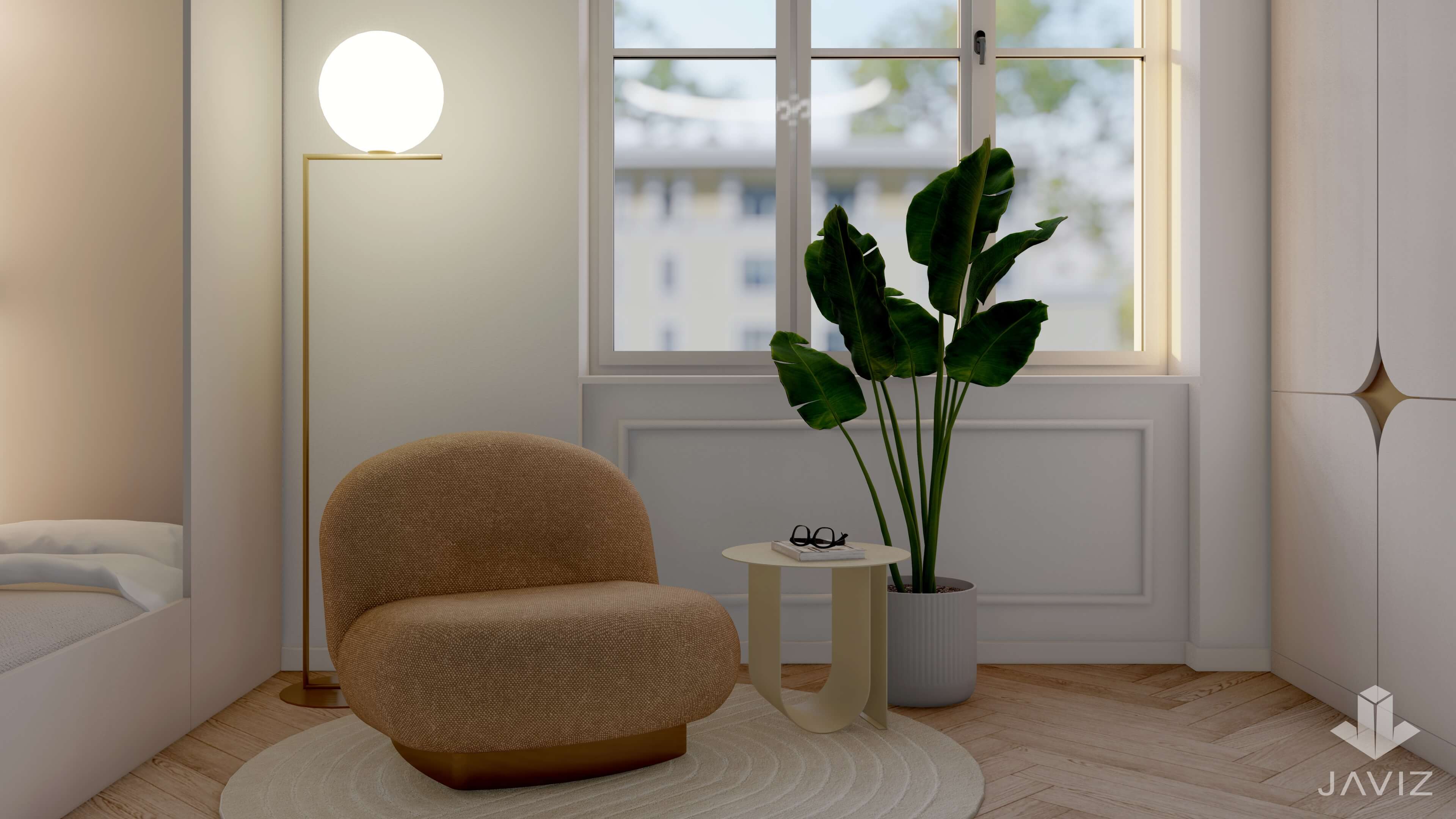 Návrh interiéru trojizbového bytu tvorí otvorená dispozícia obývačky s kuchyňou, spálňa, detská izba a chodba. Byt sa nachádza v citlivo obnovenom funkcionalistickom bytovom dome v blízkosti historickej vilovej štvrti pod Slavínom. Celý návrh v sebe nesie prvky minimalizmu s dôrazom na detail, symetriu a zladenie materiálov naprieč jednotlivými miestnosťami. V interiéri prevládajú zemité odtiene, poctivé prírodné materiály a zlaté akcenty. Organické sedenie v obývačke plynule prechádza k jedálenskému sedeniu, ktoré je obklopené tvarovo premysleným kuchynským ostrovom. Vstavaný nábytkový kubus v obývačke poskytuje okrem knižnice aj dostatok úložného priestoru. Požiadavku na diskrétne umiestnenie TV obrazovky sme vyriešili posuvnými zrkadlovými dvierkami, vďaka ktorým nepôsobí na stene nadmerne dominantným dojmom.