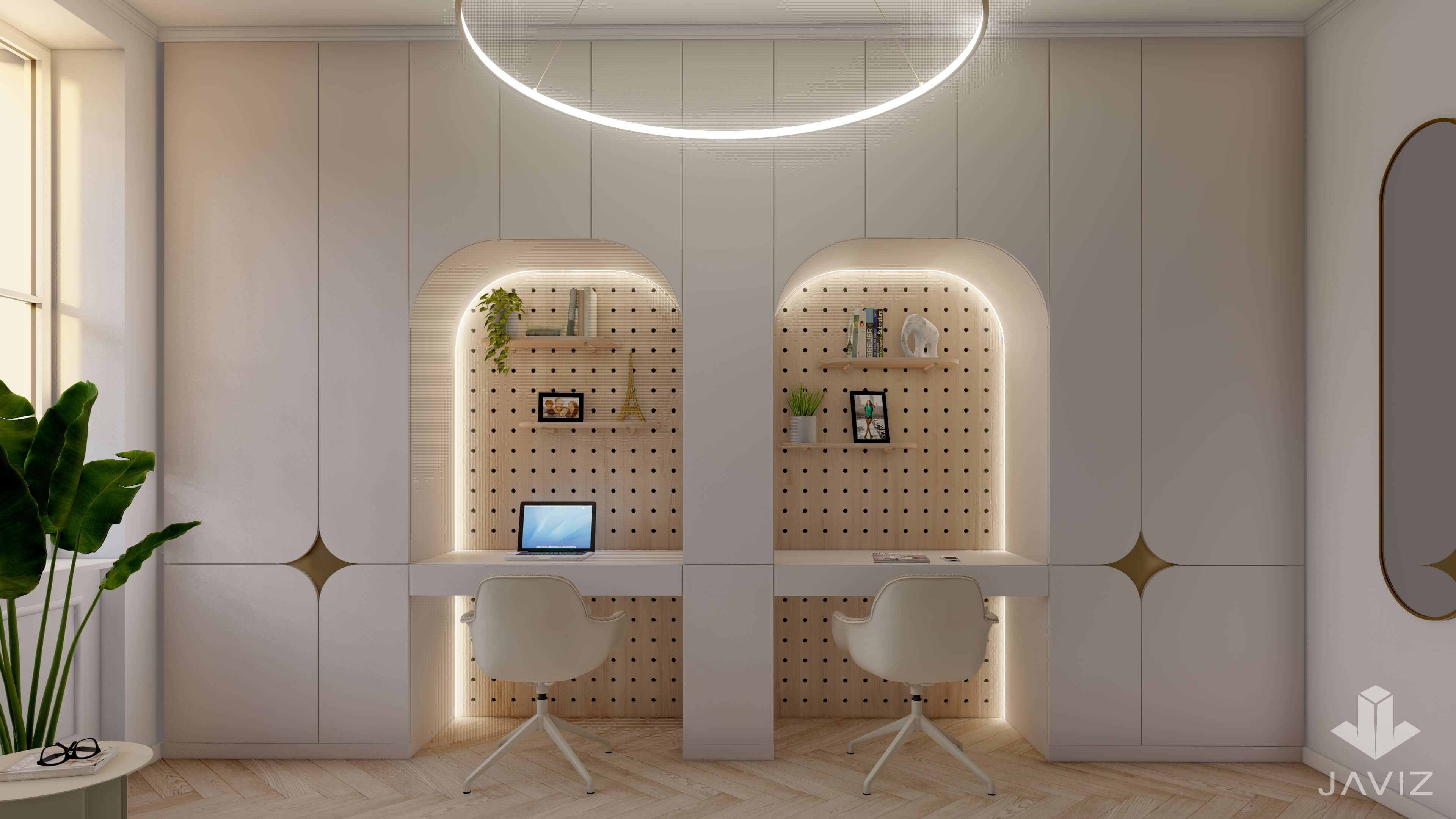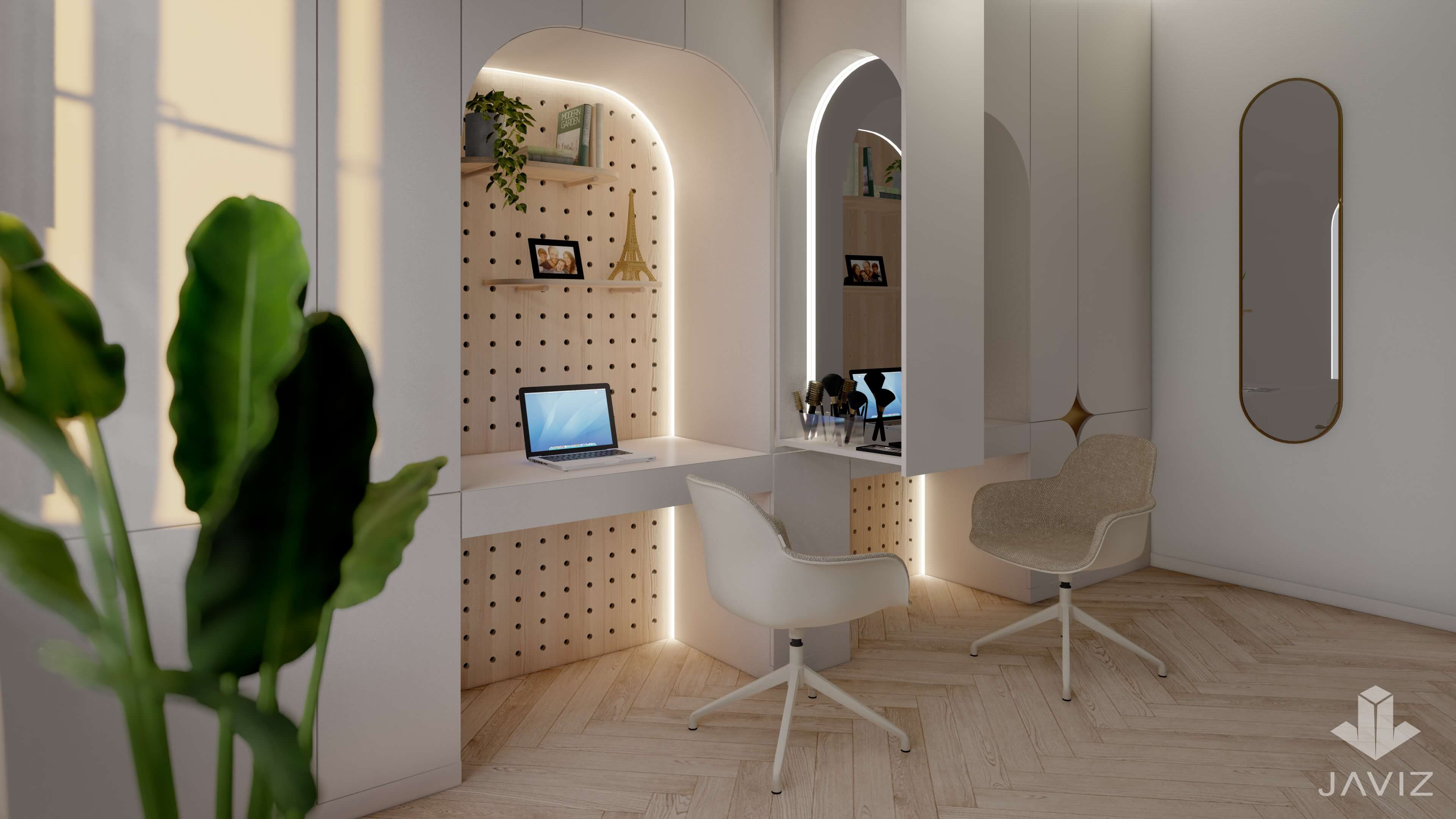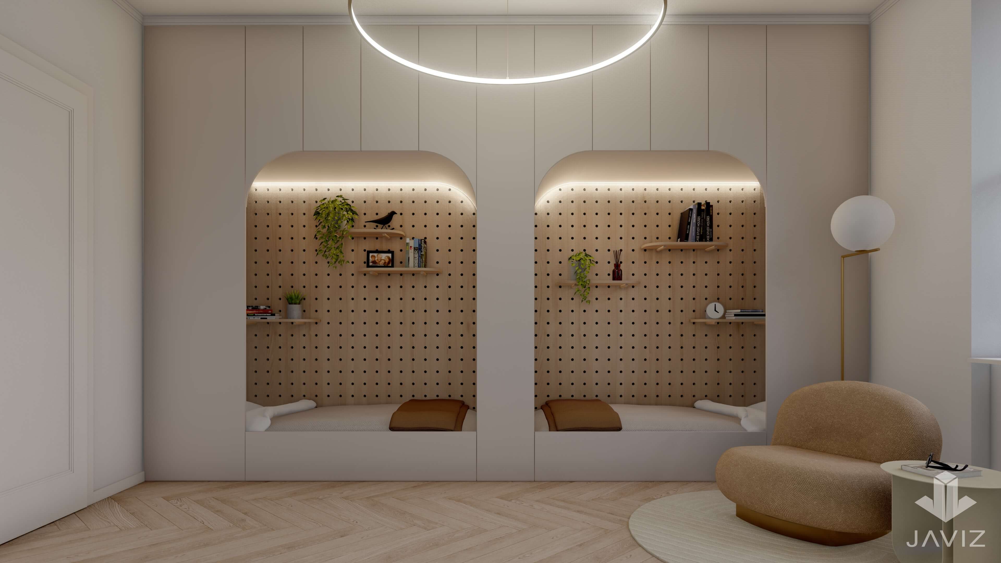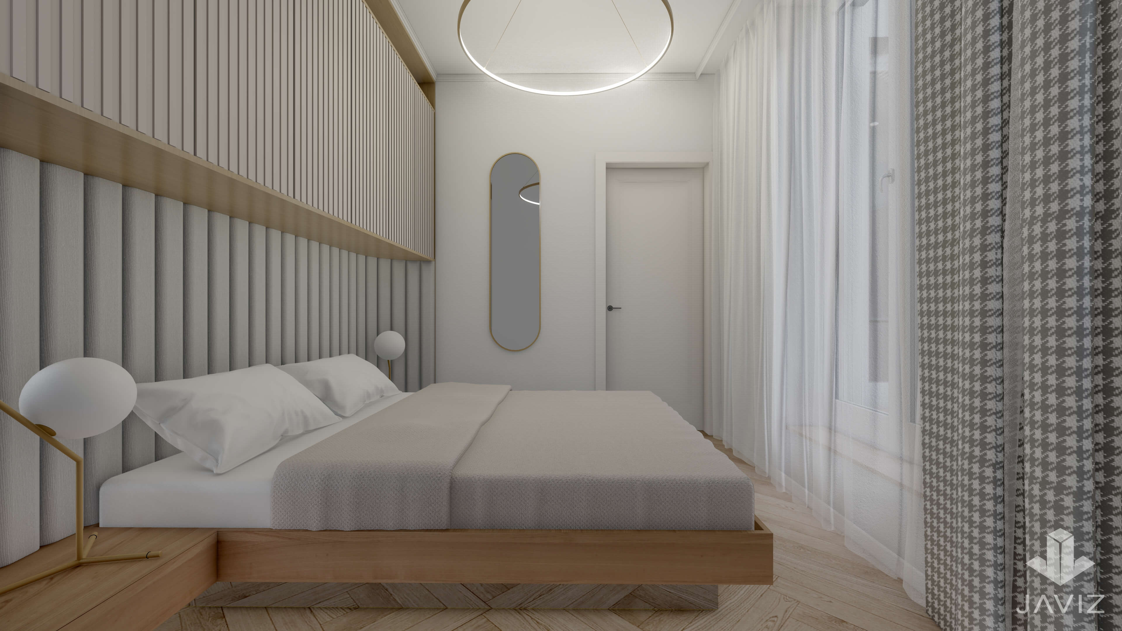 V spálni dominuje posteľ vyrobená na mieru, ktorej drevený rám prechádza k nočným stolíkom v totožnom dizajne. Vďaka zrkadlovej spodnej časti pôsobí posteľ odľahčeným dojmom. Zaoblené čalúnené čelo za posteľou dodáva spálni organický charakter. V detskej izbe je cítiť materiálovú i farebnú totožnosť so zvyškom interiéru. Organické tvary prevládajú na väčšine zriaďovacích predmetov. Zapustené postele a písacie stoly do vstavaných nábytkových kubusov zabezpečujú dostatočné súkromie a vytvárajú na oboch stenách symetricky totožné nábytkové zostavy. Drevené perforované pozadia umožňujú individuálne umiestnenie jednotlivých výškovo nastaviteľných políc. Výsuvný obojstranný toaletný stolík vhodne dopĺňa písacie stoly a prakticky funguje s otočnými stoličkami. Chodba je funkčne navrhnutá tak, aby majiteľom poskytovala čo najviac úložného priestoru a súčasne zapadala do dizajnovej koncepcie bytu.